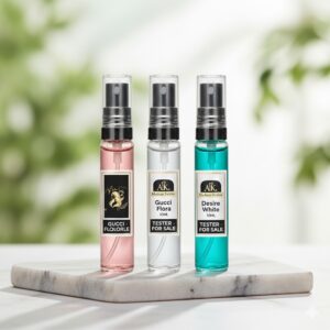 Whether you’re exploring the fresh exuberance of ‘Gucci Flora’, the crisp purity of ‘Azaro White’, or the aquatic charm of ‘Desire Blue’, these testers provide an intimate preview of our exquisite collection. Each bottle is clearly labeled for easy identification and features the iconic Madam Sahiba logo, signifying quality and elegance.